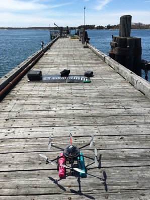Just a few minutes’ walk from Stanton’s office, out on a pier behind NOAA’s Northeast Fisheries Science Center (NEFSC), Mike Jech, who runs the Center’s Advanced Sampling Technologies Research team, prepared to launch Ginger, one of NOAA’s two new drones. (The drone’s twin is named Wasabi.) Ginger is a small but powerful hexacopter with a wingspan of 32 inches and custom feet made of pink and green pool noodles. With one hand on each foot, Jech held Ginger above his helmet. His colleague, Jennifer Johnson, stood a few paces away with the remote control. With Ginger’s rotors whirring, Jech let go, and within seconds the drone was a hundred feet in the air. Then, with Johnson piloting, Jech ducked under a black hood like an old-time photographer to watch the live feed from the digital camera mounted beneath Ginger’s body.