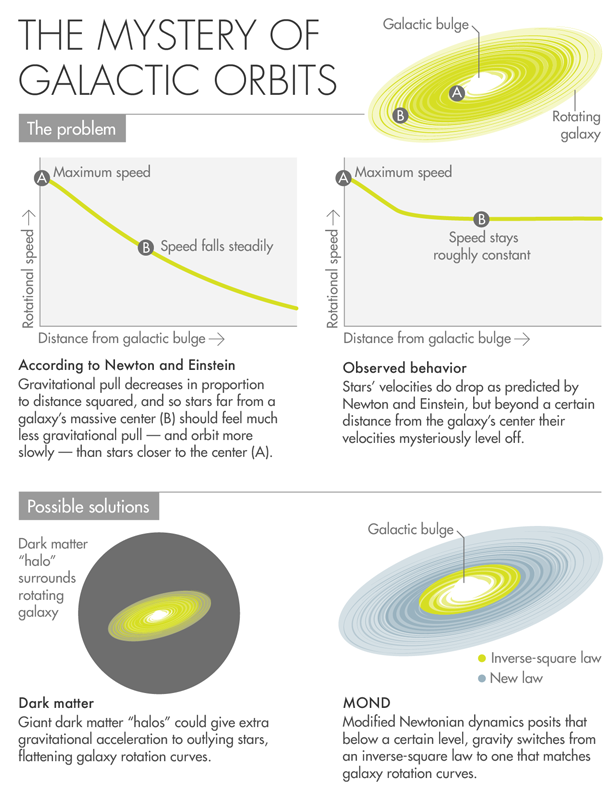 In Newton’s and Einstein’s theories, the gravitational attraction of a massive object drops in proportion to the square of the distance away from it. This means stars orbiting around a galaxy should feel less gravitational pull—and orbit more slowly—the farther they are from the galactic center. Stars’ velocities do drop as predicted by the inverse-square law in the inner galaxy, but instead of continuing to drop as they get farther away, their velocities level off beyond a certain point. The “flattening” of galaxy rotation speeds, discovered by the astronomer Vera Rubin in the 1970s, is widely considered to be Exhibit A in the case for dark matter—explained, in that paradigm, by dark matter clouds or “halos” that surround galaxies and give an extra gravitational acceleration to their outlying stars.