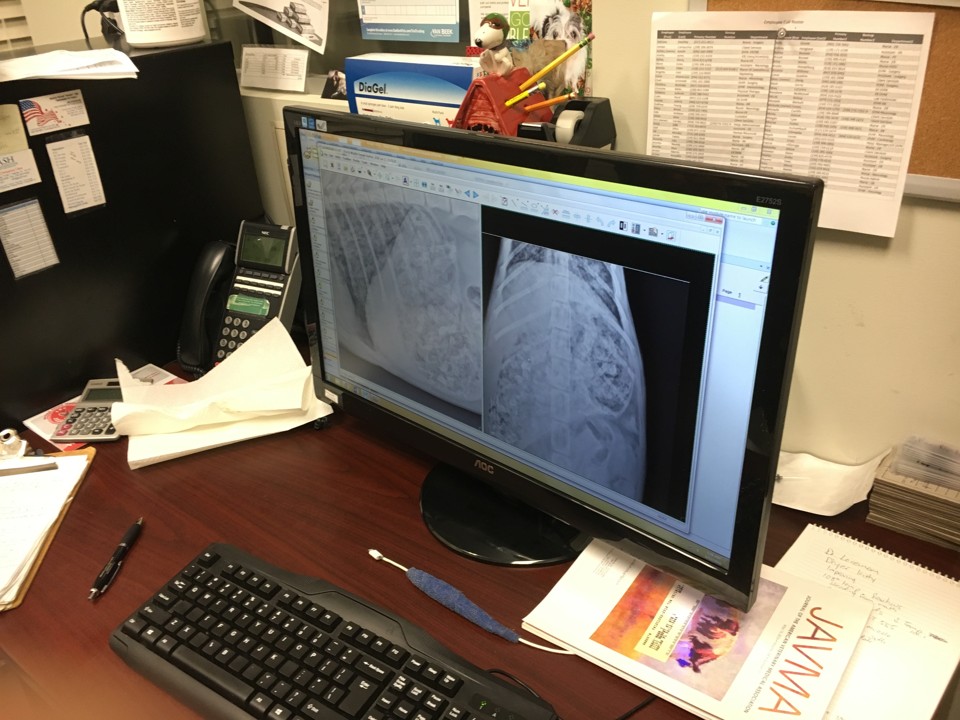 Once an X-ray had come through, the emergency vet, a stocky, muscular guy named Mark Garny, called us in to his office. “Could be worse, could be a little better. Obviously, as you know, we get them in worse shape than this.” On his computer screen, he pointed out a chipped area in her hips. “In a young pet like—” he corrected himself “—a young animal like this, it’s possible that would callus in,” Garny said. “It’s quite possible she could heal up without anything further.”