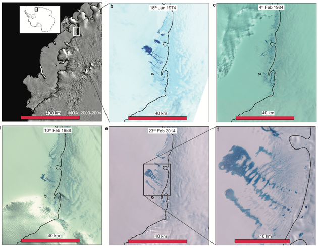 Contemporary models of the planet’s snow-and-ice system—the cryosphere—do not account for such an expansive meltwater network in Antarctica. Instead, they assumed that large meltwater ponds would rapidly melt and destroy ice shelves. In 2002, a 12,000-year-old ice shelf called Larsen-B disintegrated in less than six months after large ponds of meltwater formed on its surface. Researchers projected that future ice shelves would meet a similar fate.