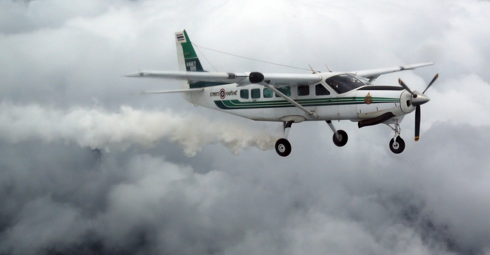 The obvious question, of course, is what makes the tiny droplets glom together. Intuitively, you might think that droplets simply collide at random and stick to one another. This process isn’t very efficient, though, and drops that form this way rarely grow large enough to precipitate out. A better way involves “seeds,” solid surfaces for water droplets to latch onto. For various reasons, once a few droplets latch onto a seed, many more follow in quick succession. As a result, droplets can finally grow heavy enough to fall out of clouds as precipitation. If you want to transform a cloud into rain, seeds are vital.