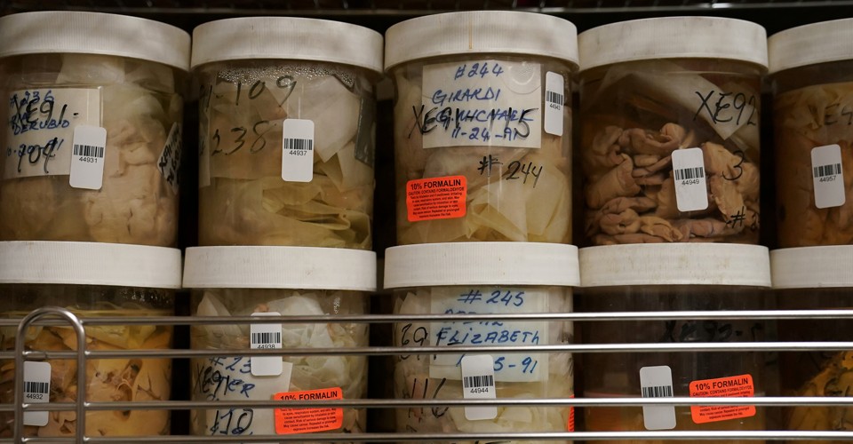The other hemisphere is typically submerged in a pungent formaldehyde bath that hardens the tissue and fixes each cell in place. Some brain banks keep this fixed hemisphere whole. Others cut it into slabs of tissue, also about a centimeter thick. They can store these slabs in tubs of formaldehyde in a walk-in refrigerator or embed them in paraffin wax and maintain them at room temperature. They can later shave the waxed blocks into delicate slices for inspection under a microscope as needed.