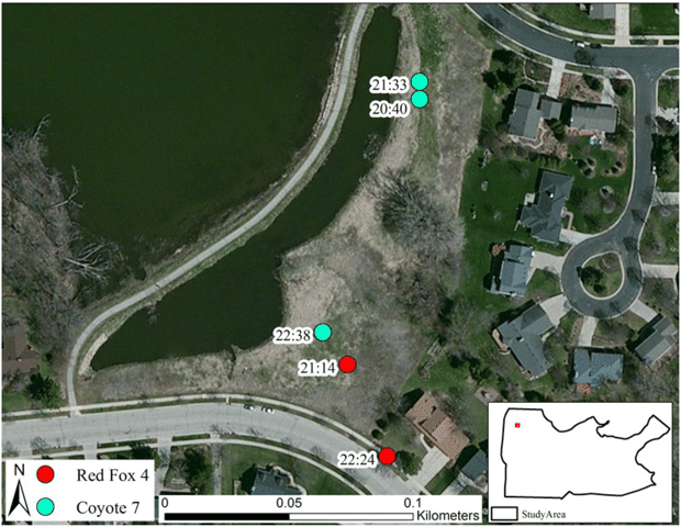To study what’s going on here, Drake and his students tracked a dozen red foxes and 11 coyotes, following their movements for about two years in the area surrounding the university campus. They found that coyotes are still driving red foxes out of their territories, but there’s more overlap in where the two species live and forage for food. At times, members of each species were found to be in unusually close proximity, with data indicating that neither displayed aggression or vulnerability.