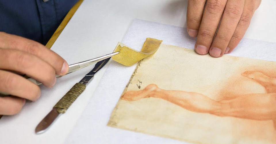 In a recent paper, a group at the University of Florence reported on a possibly more precise way of using solvents on paper: by trapping them in a gel. The gel, which Piero Baglioni, an author of the study, likened to contact lenses, confines the solvent inside a matrix of molecules, allowing it work on tape adhesive without penetrating deeper into the paper. The idea comes from painting conservators, who already use similar gels. A paper conservator, Antonio Mirabile, used Baglioni’s gels to remove tape from a handful of drawings —including a sketch of a scene from the Sistine Chapel where where they found an inscription that reads di mano di Michelangelo (“from Michelangelo’s hand”) under the tape. (Baglioni doesn’t actually think the sketch was done by Michelangelo, and their journal article suggests a collector may have used tape to cover up the false inscription.)