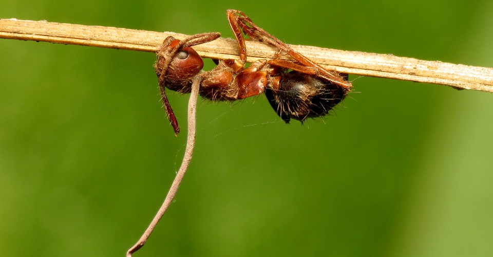 Cordyceps fungi excel at infecting and killing insects. One particular species, Ophiocordyceps unilateralis, has become famous for its ability to turn ants into zombies. It grows through an ant’s body, creating a network of filaments that commandeers the insect’s muscles. Then it compels the ant to climb a plant stem, and clamp its jaws on the underside of a leaf. Once the ant is in position, the fungus sends a long stalk through its head, culminating in a ball full of spores that rain downward and hit the ant’s colony-mates as they go about their foraging trips. In this way, the zombie fungus can claim an entire colony. It excels at infiltrating popular culture, too: It’s the organism behind the monsters of The Last of Us and the zombies of The Girl With All the Gifts.