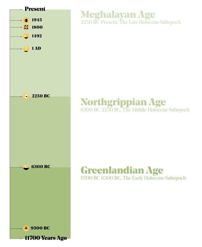 The Late Holocene starts about 4,250 years ago, during a massive drought that struck Eurasia and destroyed several ancient societies. The team found clear evidence of that event in a cave in Meghalaya, a state in northeastern India, so the age is termed the Meghalayan.
