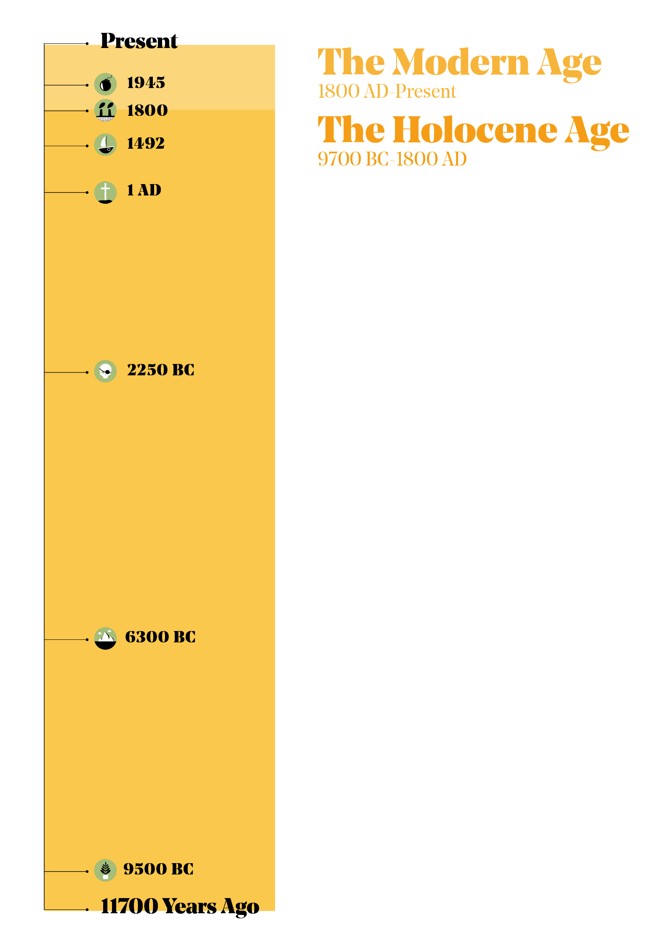 But the Holocene is everything for humans. It encompasses all of human history and much of our prehistory: the flourishing of the first cities, the revelation of every major religion, and the invention of the rifle, the rice paddy, and the radio.