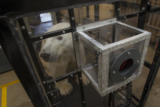 Down in San Diego, the keepers decided that Tatqiq, a then-16-year-old female, would be the lucky bear. At first, Tatqiq’s keepers let her into the chamber with the treadmill off. She would lie or stand in there for a few minutes at a time and collect her food reward. Several weeks later, they turned the treadmill on at the slowest setting. “Of course the floor moves and that changes everything,” Owen says. Tatqiq headed for the exit.