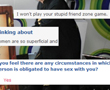 The Nice Guys of OkCupid featured all of these mind-sets in spades, taking what had been a somewhat abstract cultural critique and making it concrete with real life-examples and shareable images. There were complaints about "falling into the friend zone" (a term which refers to the idea that women divide men into platonic friends and romantic prospects, and that once you fall into one category, you can't jump over into the other) and about how "shallow and superficial" American women are. There was bitterness over nights spent talking, texting, and holding hands, with no physical or emotional pay-off. Then there were reams of professed political views that, if not definitively "not nice," are certainly not popular with many people on the liberal left.
