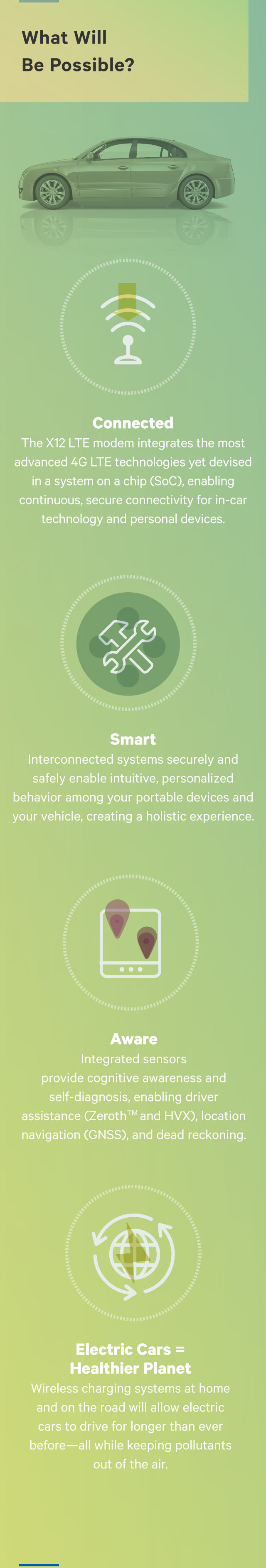 Qualcomm has been improving the connectivity, convenience, and safety of cars for more than a decade. The company developed the 3G/4G-, Bluetooth- and Wi-Fi-enabled processors that allow us to connect our smartphones to our cars so that we can stream music and make phone calls.