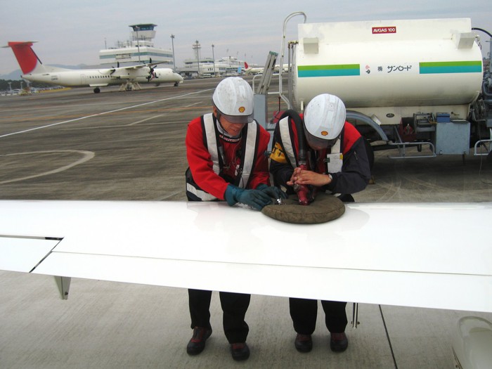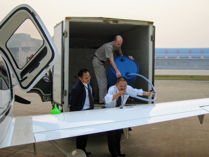 This is the recent scene: yesterday afternoon, Naha airport, Okinawa, Japan. Line crew gassing up a Cirrus SR22: