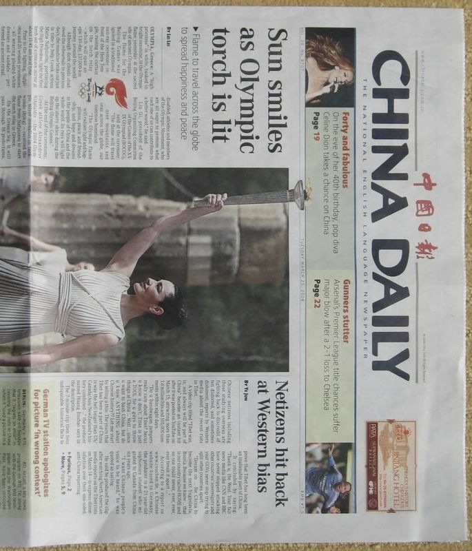 Today's illustration: front page of China Daily, official voice to the outside world. Story at top left, about lighting of Olympic flame, contains not one word about protesters who disrupted the ceremony in Greece. (Local Chinese TV coverage also cut away at that instant.) Story at top right, today's update on the Tibet saga, is about the unified outrage of China's web population over Western news distortions. Eg,