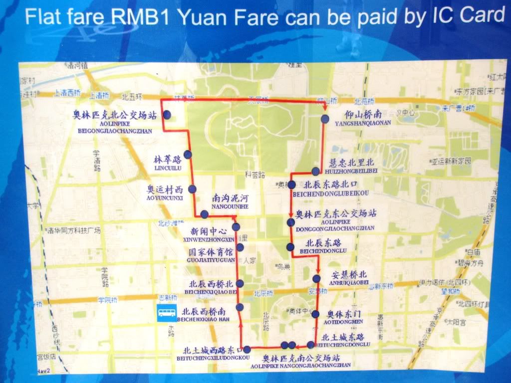 Why Guojiatiyuguan couldn't be "National Stadium" or "Bird's Nest," I can't say. Or Aolinpike Beigongjiaochangzhan couldn't be "Olympic Transport Station - North." Or Aoyuncunxi instead of "Olympic Village West." Why the legend about the 1RMB payment (waived for most people with Olympics tickets) is in English but info on where they're going is not.... again, who knows. But for the record, this is what a map looks like.