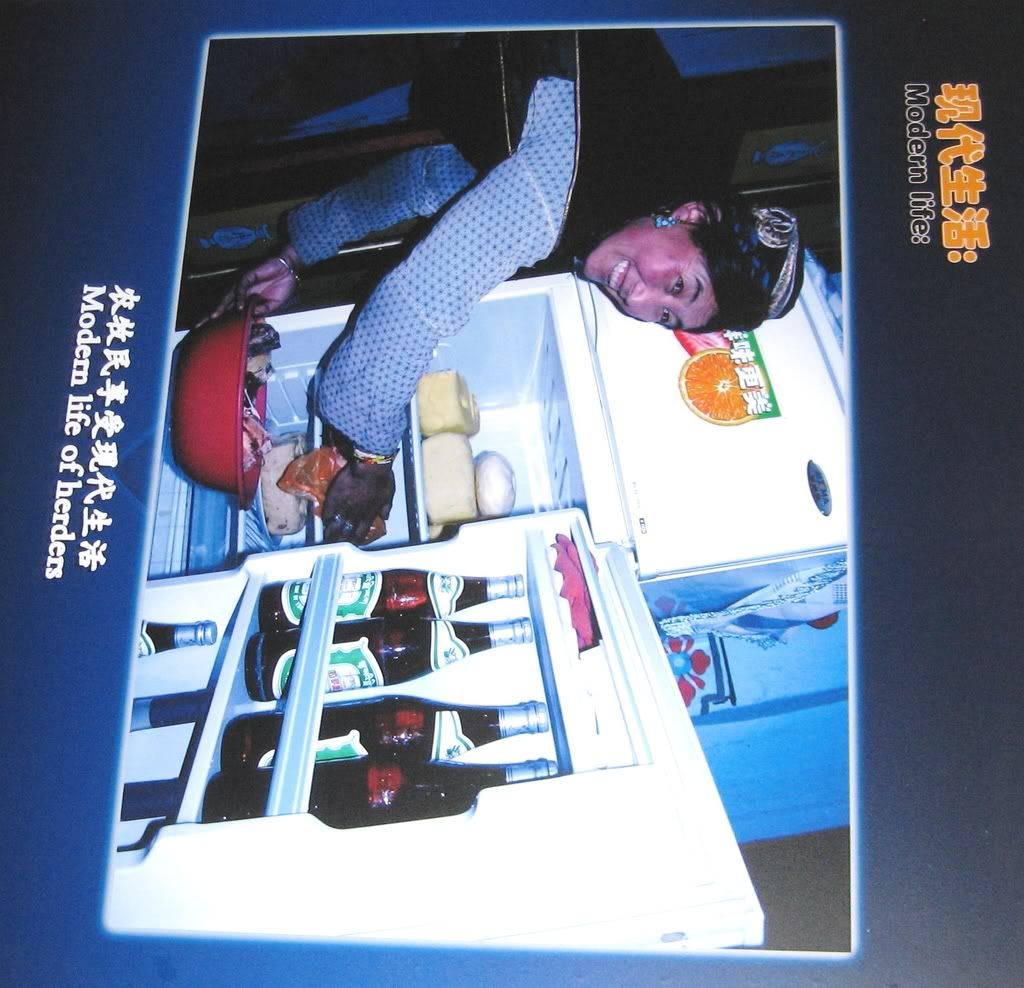 (Beijing exhibit photo, showing a Tibetan woman grateful to have a modern fridge full of beer.)