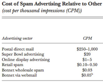 "We advocate supplementing current technological anti-spam efforts with lower-level economic interventions at key choke points in the spam supply chain, such as legal intervention in payment processing, or even spam-the-spammers tactics," they conclude. "By raising spam merchants' operating costs, such countermeasures could cause many campaigns no longer to be profitable at the current marginal price of $20-50 per million emails."