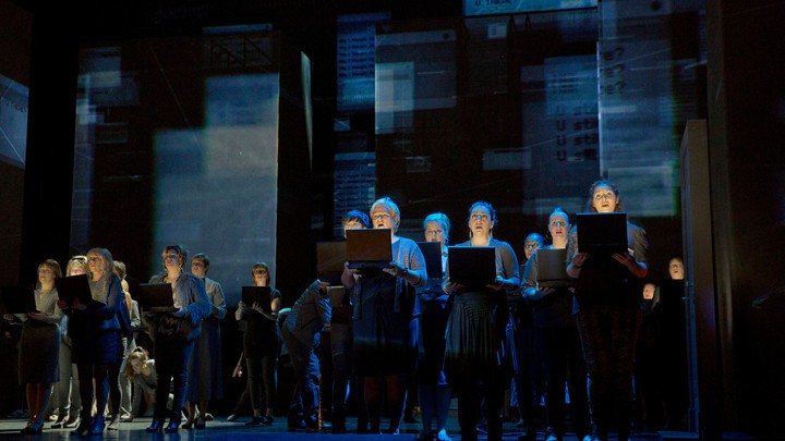In its choruses, in its gliding towers, the opera gives the Internet dimension. Dancers, moving forward and backward on the stage, give it depth; their jagged stops and starts hint that the web has its own time. They are mimicking computers, which are, themselves, mimicking tools.