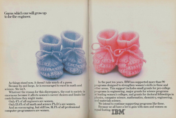 And then there's the ad above, unearthed and de-archived by our own Chris Heller, which stands out from the others in one particularly notable way: It isn't, actually, terribly dated. It feels, actually, quite contemporary. It's for IBM, one of those pitching-products-without-actually-pitching-products kinds of ads, and it complains about a problem that is just as relevant today as it was in 1985: the dearth of women in engineering jobs.