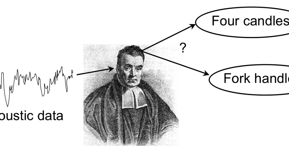 Thus the image at the top of the page (taken from here, as is the example that follows). Acoustically, the phrases "I want four candles" and "I want fork handles" are practically identical, and if you listened to a recording with no other info, it would be 50/50 which statement the speaker had in mind. But if you're hearing this in a candle store, the probability changes in one way -- having nothing to do with the actual sound -- and in a cutlery store it changes the other way. There's much more to the concept, but that is the main idea. [Mea culpa! I did not know about the "Two Ronnies" episode on Fork Handles, but now I do.]