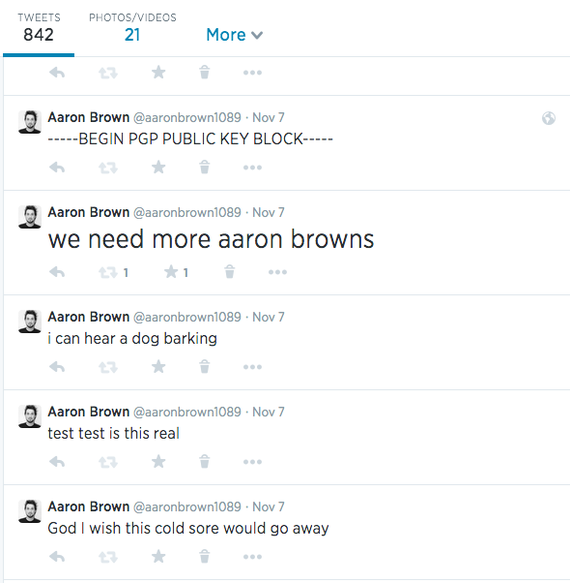 No one likes being subliminally influenced, discriminated against, or taken advantage of, yet these are all legitimate concerns that come with surveillance. These concerns are heightened as we increasingly live online. Digital surveillance is pervasive and relatively cheap. It is fundamentally different than anything we’ve faced before, and we’re still figuring out what what the boundaries should be.For now, Aaron’s IDs and documents are still sitting inside my desk. Aaron himself actually went missing a little while ago. I used Amazon’s Mechanical Turk marketplace to solicit descriptions from strangers, and then hired a forensic artist to draw a sketch. He resurfaced on Twitter. (You can go here to try tweeting as Aaron Brown.) But other than that, no word. I have a feeling he’ll probably pop up in Cleveland at some point.