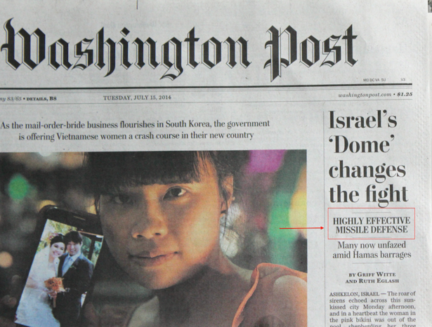 In its lead story this morning, the WaPo tells us that Israel's famous "Iron Dome" air defense system has been a huge technical success that has changed the realities of battle. The system, for the record, was developed in Israel, is produced by U.S. and Israeli contractors, and is mainly funded by the United States.