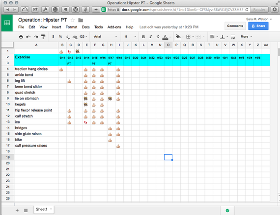 Thankfully, my penchant for self-tracking lends itself to my physical therapy exercises. What my Fitbit couldn’t do for me, I built for myself in the form of a spreadsheet. Each week I add more elements to my protocol. In the process, I've realized that reminding myself to do the exercises at all is more important than the counting itself. So instead of adding up reps, I'm dropping in emojis, like little gold stars for completing my daily recovery chores.