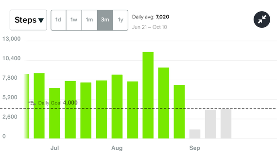 It's not as easy as it should be to change your goals on Fitbit. And the reports aren't designed to adapt as your goals change over time. My goal was 10,000 steps last month, but you can't see that contextual change in the three month report now. There is only today's goal. Glowing green shows me all the days I met and exceeded my new goal. My recovery time looks sad, grey, and unaccomplished.