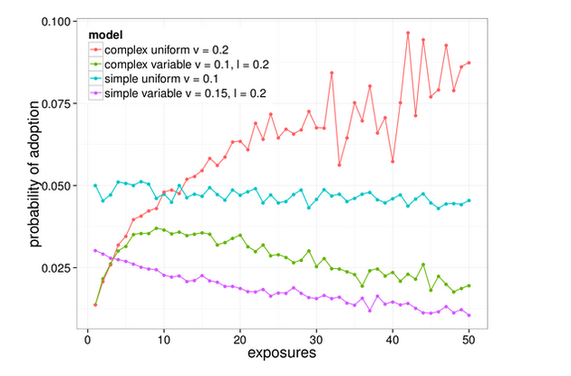 In their study, State and Adamic asked the question: how many times do you need to see a friend change their profile picture before deciding to change your own? They set up two competing hypotheses. The first possibility was that profile changes spread like funny pictures and other online memes, falling off in influence as more people share them. The second possibility they considered was that people need to see others make the change before they follow suit, that “multiple exposures are most effective in determining the adoption of... [costly] behaviors.”