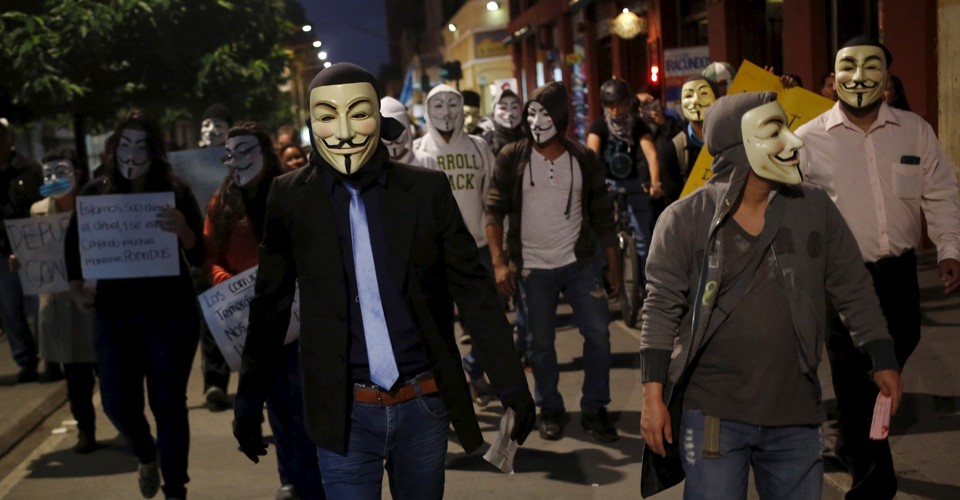 Drawing on the group’s trademark style, the video features grainy footage of a person in a Guy Fawkes mask who speaks through a voice changer, to ominous effect. The speaker singles out Donald Trump’s proposal to ban Muslims from entering the United States.