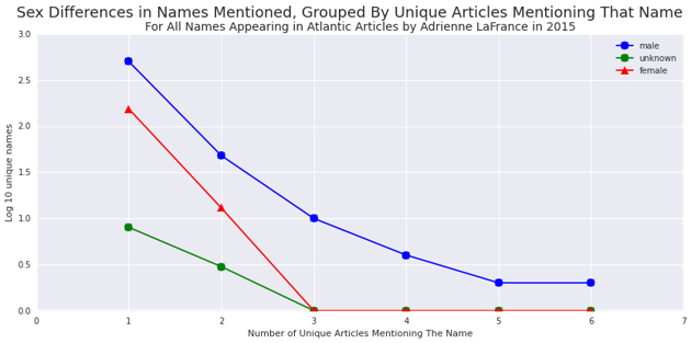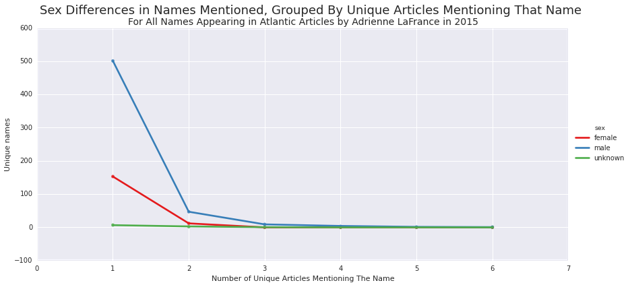 We included 192 of the articles I wrote for The Atlantic last year. All in all, I mentioned 736 different people and only 165 of them were women—meaning women accounted for just over 22 percent of the unique individuals I named or quoted in my work last year. (If you look at total mentions instead of unique mentions, it’s even worse. Out of the 2,301 names that appeared in my work last year, 1,839 of them were men. That leaves just 428 mentions of women: under 19 percent of total mentions. This suggests, and we were later able to confirm, that even when I do mention women, I give men more space in my stories.)