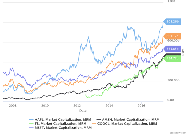 In mid-May of 2007, these five companies were worth $577 billion. Now, they represent $2.9 trillion worth of market value! Not so far off from the combined market cap ($2.85) of the top 10 largest companies in the second quarter of 2007: Exxon Mobil, GE, Microsoft, Royal Dutch Shell, AT&T, Citigroup, Gazprom, BP, Toyota, and Bank of America.