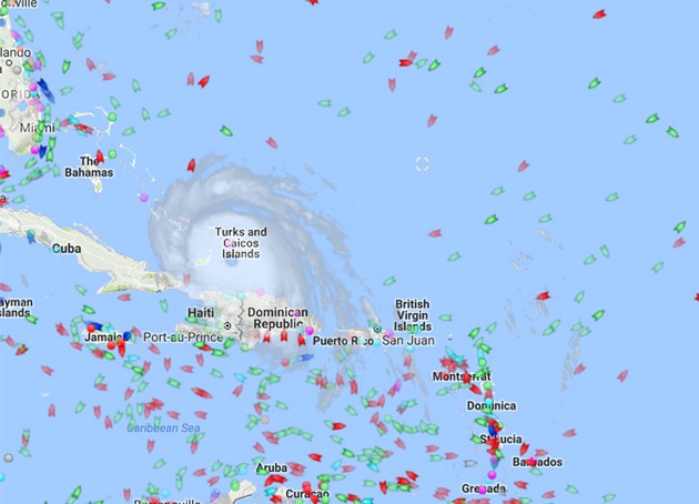 Already, ships are returning to routes that are behind the storm and clearing out of the areas that remain in the path. This map shows MarineTraffic data overlaid with a roughly contemporaneous image of Irma from the GOES satellite on Thursday.