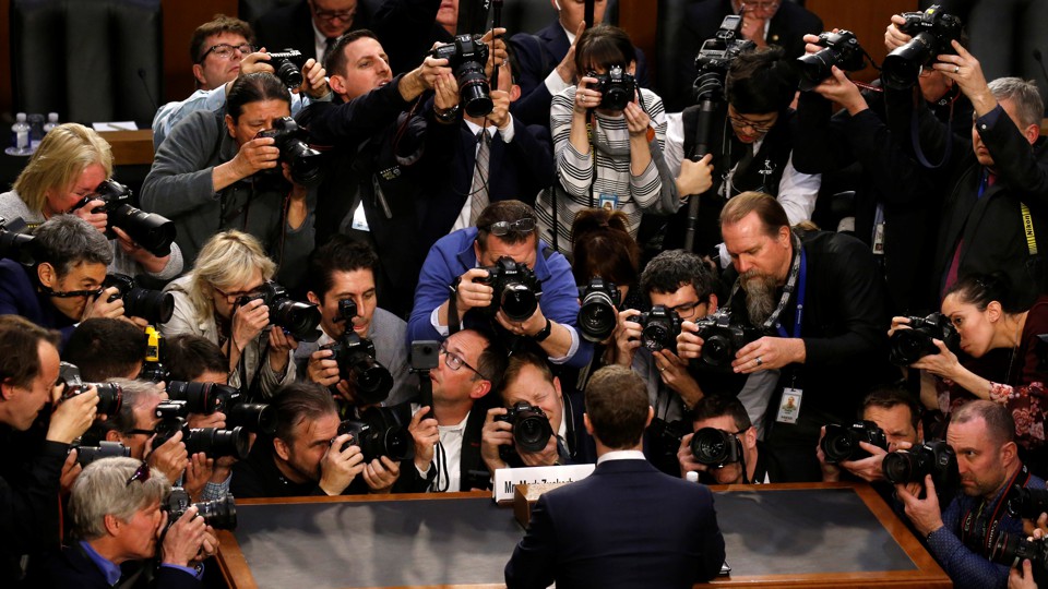 Mark Zuckerberg finally walked into Congress today in a suit and Facebook-blue tie. He sat alone in a chair, behind a brown wooden desk, backed by a short-row of Facebook lawyers, and facing a U of nearly half the Senate, a joint hearing of the Senate Judiciary and Commerce Committees.