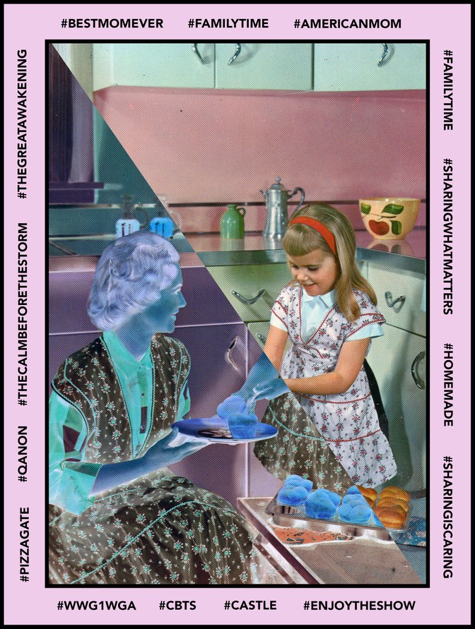 Time spent there is reciprocal, a never-ending exchange of sweet words and the heart icons that are the only possible way to instantly respond to a piece of content on the platform. Instagram is women’s work, as it demands skills they’ve historically been compelled to excel at: presenting as lovely, presenting as desirable, presenting as good, safe, nonthreatening. All of which, of course, are valuable appearances for a dangerous conspiracy theory to have. Ironically, following many of the QAnon hobbyists will lead to a suggestion from Instagram that you follow Chrissy Teigen, one of QAnon’s designated villains, who also happens to have created a brand based on a desirable domestic life. The platform itself is operating on its interpretation of beautiful surfaces, and far less so on what the people producing them are saying.